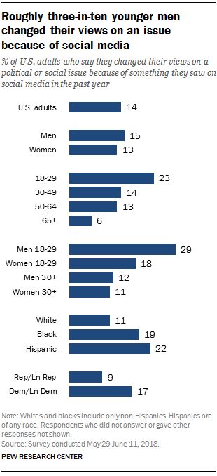 Certain groups, particularly young men, are more likely than others to say they’ve modified their views because of social media. Around three-in-ten men ages 18 to 29 (29%) say their views on a political or social issue changed in the past year due to social media. This is roughly twice the share saying this among all Americans and more than double the shares among men and women ages 30 and older (12% and 11%, respectively).