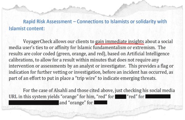 In fact, Voyagerโs own language exposes a fatal weakness in its approach: fundamentalism and extremism are not illegal, and an โaffinityโ for them is not evidence of planning for violence. Even an accurate categorization of individuals with โtiesโ to โextremeโ ideologies, whether underpinned by Islamic or any other beliefs, would provide no actionable information to law enforcement.