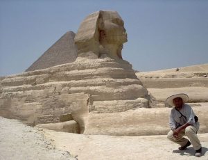 The Great Sphinx, located among the Pyramids of Giza, is the largest monolith statue in the world, standing 241 feet long, 63 feet wide, and 66.34 feet high. Carved out of limestone , it represents a mythical creature known as a sphinx, with a lion’s body and a human head. It is commonly believed that the head of the Great Sphinx is that of the Fourth Dynasty (2680-2565 BCE) pharaoh Khafre, whose pyramid stands directly behind the giant sculpture.