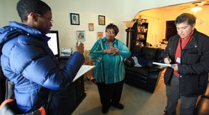 Elevate Energy buildings staff discuss with a resident how improvements will reduce utility bills and help make her home healthier. Photo courtesy of Elevate Energy