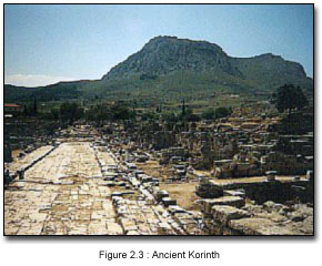 The roads in the Korinthia followed the natural openings between mountains, entering Korinth at several places. Probably the most important route was that running from Attica and northern Greece along the Isthmus and entering the Peloponnesos right at the Sanctuary of Poseidon. This road, whose traces have been found by Professor Broneer in the Sanctuary itself, would have continued westward to Korinth itself, and from there to the rest of the Peloponnesos. From Korinth there were major roads running west to Sikyon and several roads running south, along the river beds, toward the Argolid. Roads also ran from Korinth to the ports at Lechaion and Kenchreai, and an important road probably connected Lechaion directly with the harbor at Kenchreai. These, along with the Diolkos (which ran along the course of the modern canal) would have seen vehicles of all kinds, carrying foodstuffs, manufactured products, and raw materials (such as sandstone blocks). The roads ran among the rich agricultural fields and also carried the foot traffic of politicians, pilgrims going to worship at the sanctuaries, and armies marching on maneuver or to fight in war. All of this activity, set against the mountains and seas that both limited and facilitated transport, characterized the Korinthia and made it one of the crossroads of the Ancient World.