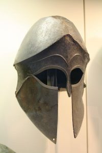 A bronze Corinthian helmet (6-5th century BCE). / Olympia Archaeological Museum.