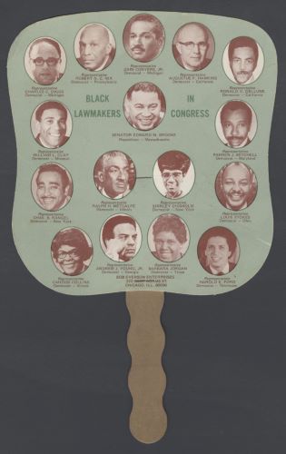 Not all fans were for campaigns, however. Two fans in the House Collection publicize the achievements of African Americans in Congress. The older of the two, from the 1950s, shows the four Black Members of Congress surrounding an image of the Capitol. By the 1970s, the number had grown to 16 and edged out any extraneous illustrations. The fans were distributed by a North Carolina insurance company with strong ties in the African-American community. They published at least three iterations of this theme over the decades it took for the Black membership in Congress to grow from the handful of the 1950s to a group large enough to found the Congressional Black Caucus and, soon thereafter, to a number so large it would never fit on a fanโs surface again.
