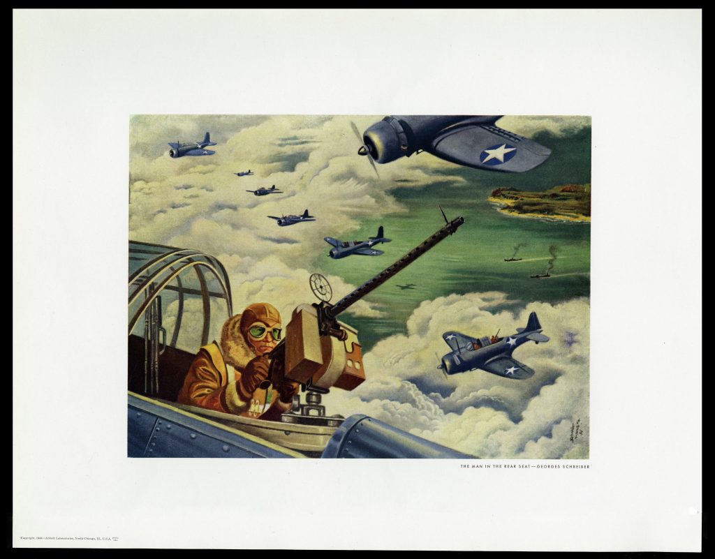 Much of the popular visual culture of the WWII era was devoted to depictions of the American serviceman. Not surprisingly, soldiers were most often represented as energetic, handsome, and for the most part, white. Private companies like Abbott Laboratories sponsored artists, illustrators, and journalists to create visual materials that supported the war effort. Renowned American artists made the drawings and paintings from which these frameable prints were copied.