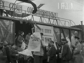 The project to spread political messages and to educate using agit-trains and steamers was definitely a huge administrational and logistical undertaking. It held an important position in the Party Activities for Agitation. Between December 27, 1918 and December 12, 1920, the collective for agit-trains and steamers held 1,891 meetings, where 2,752,000 participants listened to 1,008 presentations. These one and all the following statistical data was taken from Lidiia Maksakovaโs book Agitpoezd โOktiabrโskaia Revoliutsiiaโ (1919-1920). In the year 1919 alone, 753 meetings (with more than a million attendees) and 400 gatherings of other kinds were held. More than 1,740 offices and organisations in the cities were involved. The print shops produced 1.5 million copies of newspapers and 1.5 million leaflets. Informational material worth more than 11 million roubles was given out and more than 2 million people attended cinema screenings and concerts. Furthermore, exhibitions were organized on the steamer RED STAR and on the train RED EAST. Two examples from Kinonedelia No. 23 / Film-Week No. 23 (Dziga Vertov, 1918, USSR) and especially the Kinonedelia No. 17 / Film-Week No. 17 (Dziga Vertov, 1918, USSR) allow some insight. In Fig. 4 we can see how agitational literature is being distributed to returning prisoners of war. Fig. 5 shows agit-trains carrying propaganda literature, which is later handed out to and read by the villagers.