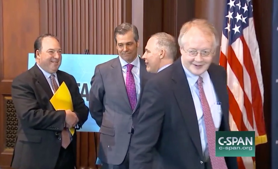 After shaking hands with Myron Ebell of the Competitive Enterprise Institute (CEI), EPA Administrator Scott Pruitt talks to Mitch Bainwol of the Auto Alliance and John Bozella of the Global Automakers trade group. Image Credit: C-SPAN