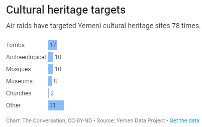 Finally, Yemen’s cultural heritage has been attacked. In all, at least 78 cultural sites have been damaged or destroyed, including archaeological sites, museums, mosques, churches and tombs, as well as numerous other monuments and residences that have great historical and cultural significance.