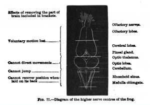Figure 3: Frog brain structures, along with summary of pithing results circa 1898.[31]