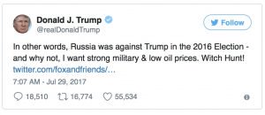 As the week mercifully ended, Congress passed with near unanimity and sent to the king a veto-proof bill strengthening Russia sanctions that effectively ties his small hands and infuriated Vlad the Impaler, and the king let out a mighty blast at Senator Lisa Murkowski, who along with Collins and John “He’s No Hero” McCain, had spelled defeat for the final Obamacare replacement bill. This was after Interior Secretary Ryan Zinke’s crude blackmail attempt failed to move the Alaskan. For good measure, the king scolded Congress in a Saturday tweet for looking “like fools” and being “total quitters” and threatened to cut their own insurance plans, which actually may be the first good idea he’s had.