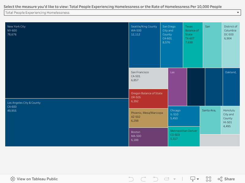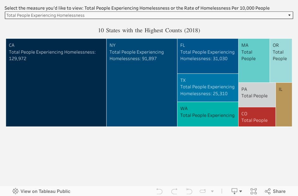 Understanding where homeless people are located can help address the problem. There is more than one approach to identifying the places experiencing the greatest challenges. The below visualization shows the Top Ten States in terms of the number of homeless people, and the rate of homelessness.