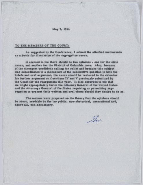 The diehard segregationist campaign of “massive resistance” took many forms. In Virginia’s Prince Edward County, location of one of the original school-segregation cases, local authorities evaded court-ordered integration by closing the public schools and supporting new, white-only, private schools. The Supreme Court reviewed these actions in 1964. This handwritten draft ruling by Justice William O. Douglas indicates his frustration with “over a decade” of delays since Brown: “Afterward numerous opinions were written by the District Court and the Court of Appeals but our mandate in the Brown case has never been implemented.”
