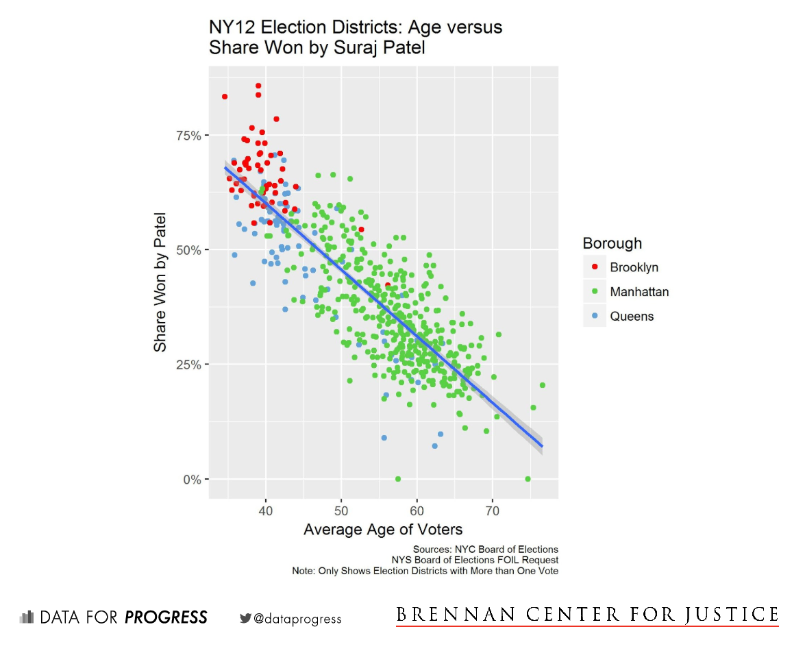 Suraj Patel similarly challenged incumbent Democrat Rep. Carolyn Maloney in New York’s 12th district. Patel, too, was widely supported by younger voters in a district that crosses three boroughs (Manhattan, Queens, and Brooklyn). Patel won 55 percent of the election districts where the average voter was under the age of 55. He won just four of the 280 election districts where the average voter was 55 or older. Although turnout in the 12th was higher among young voters than in the 9th or the 14th (13 percent of registered Democrats under 40 cast a ballot), so too was the turnout rate among older voters in the district. In fact, the turnout gap between older and younger voters was highest here. Furthermore, while younger voters supported Patel substantially more than their older neighbors, that support was not nearly as concentrated as it was for Ocasio-Cortez.